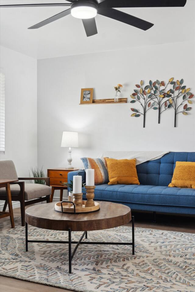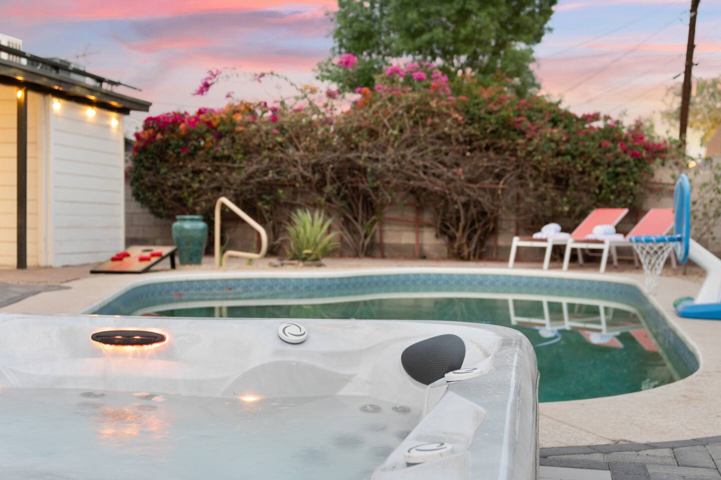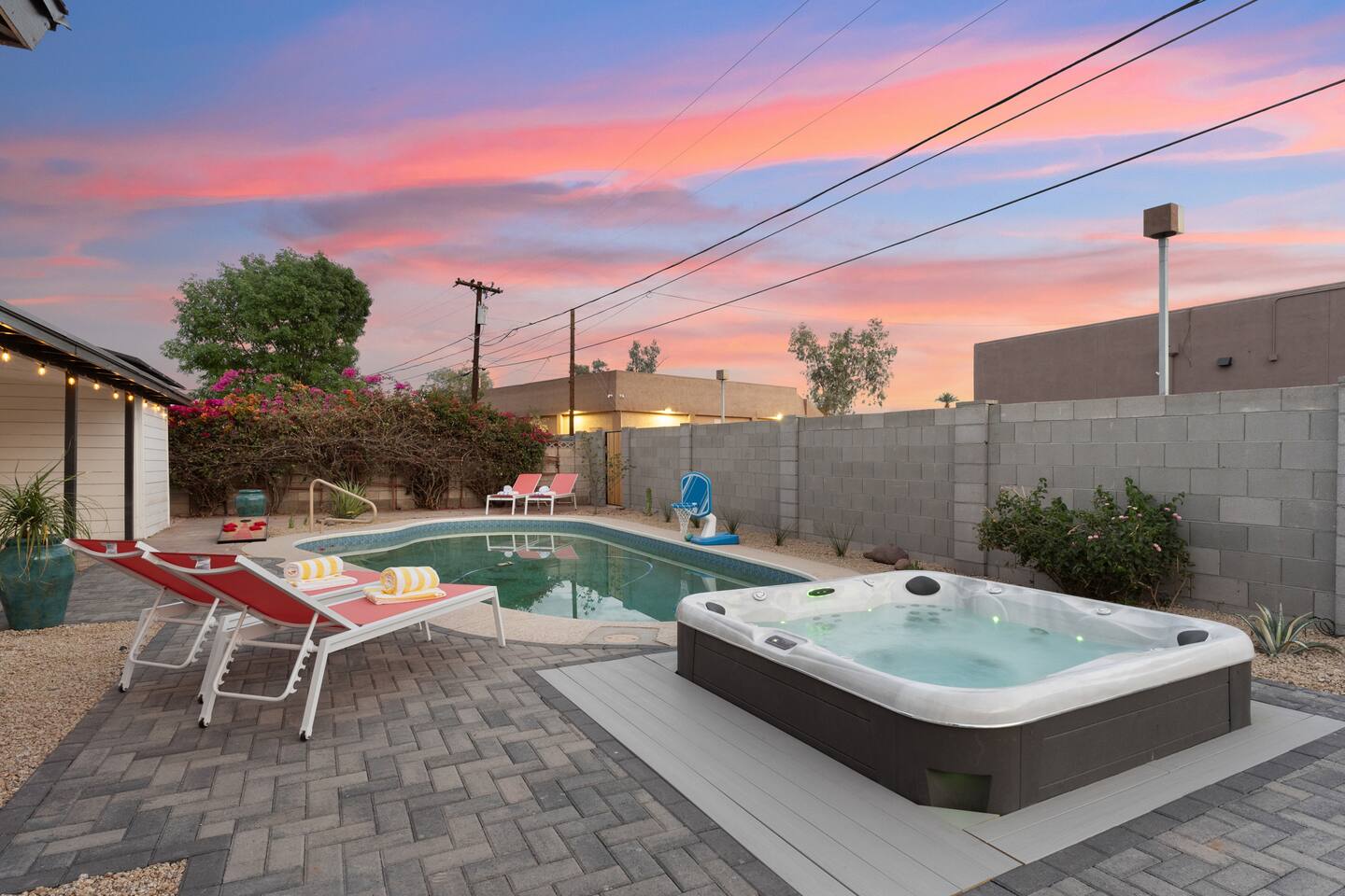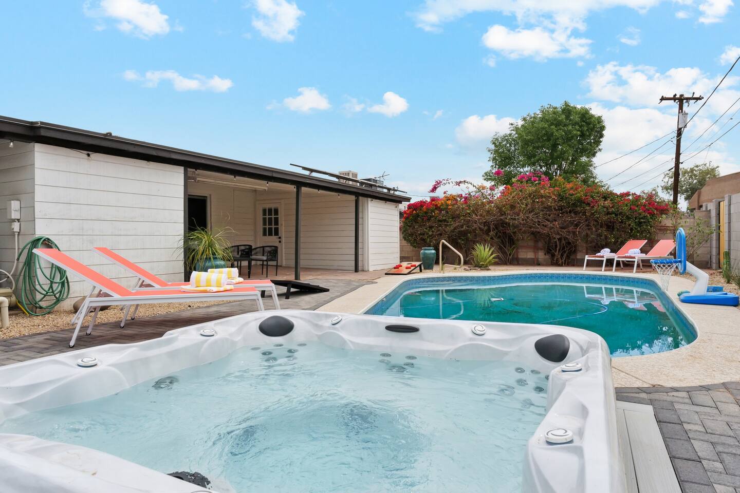 With room to sleep up to 10 guests, the home features four well-appointed bedrooms and a queen sofa bed in the living room. Each bedroom includes nightstands with USB charging ports and Roku smart TVs (please note: one bedroom TV is currently unavailable). Sleeping Arrangements: Primary Bedroom: King bed Bedroom 2: Queen bed Bedroom 3: Queen bed Bedroom 4: Full-over-Full bunk with Twin trundle Living Room: Queen sofa bed Relax & Recharge Outdoors: Lounge by the sparkling pool (heating available for an additional fee), soak in the bubbling hot tub, or gather around the newly-built fire pit as the desert sun sets. Colorful loungers, outdoor games like cornhole, and pool toys make this backyard a hit for all ages. Cook, Dine & Gather with Ease: The fully renovated kitchen comes stocked with cookware, coffee maker, French press, and electric kettle. The dining room seats eight and includes a high chair for your little one. The spacious living room features a 65" Roku smart TV and plenty of comfortable seating for movie nights or group hangouts. Home Highlights: - 2 updated bathrooms with hand soap, body wash, shampoo, conditioner, and full towel sets - In-home laundry with washer & dryer - High-speed Wi-Fi and smart TVs throughout - Carport and driveway parking, plus street parking - Easy keyless entry - Dog-friendly (max 2 dogs, $25 per pet, per night) Whether you're visiting for a game, campus tour, or simply to unwind, Serene Sonoran Retreat offers the ideal space to relax, reconnect, and enjoy the best of Tempe and beyond. Tempe STR License: STR-001117. TPT License: 21586465